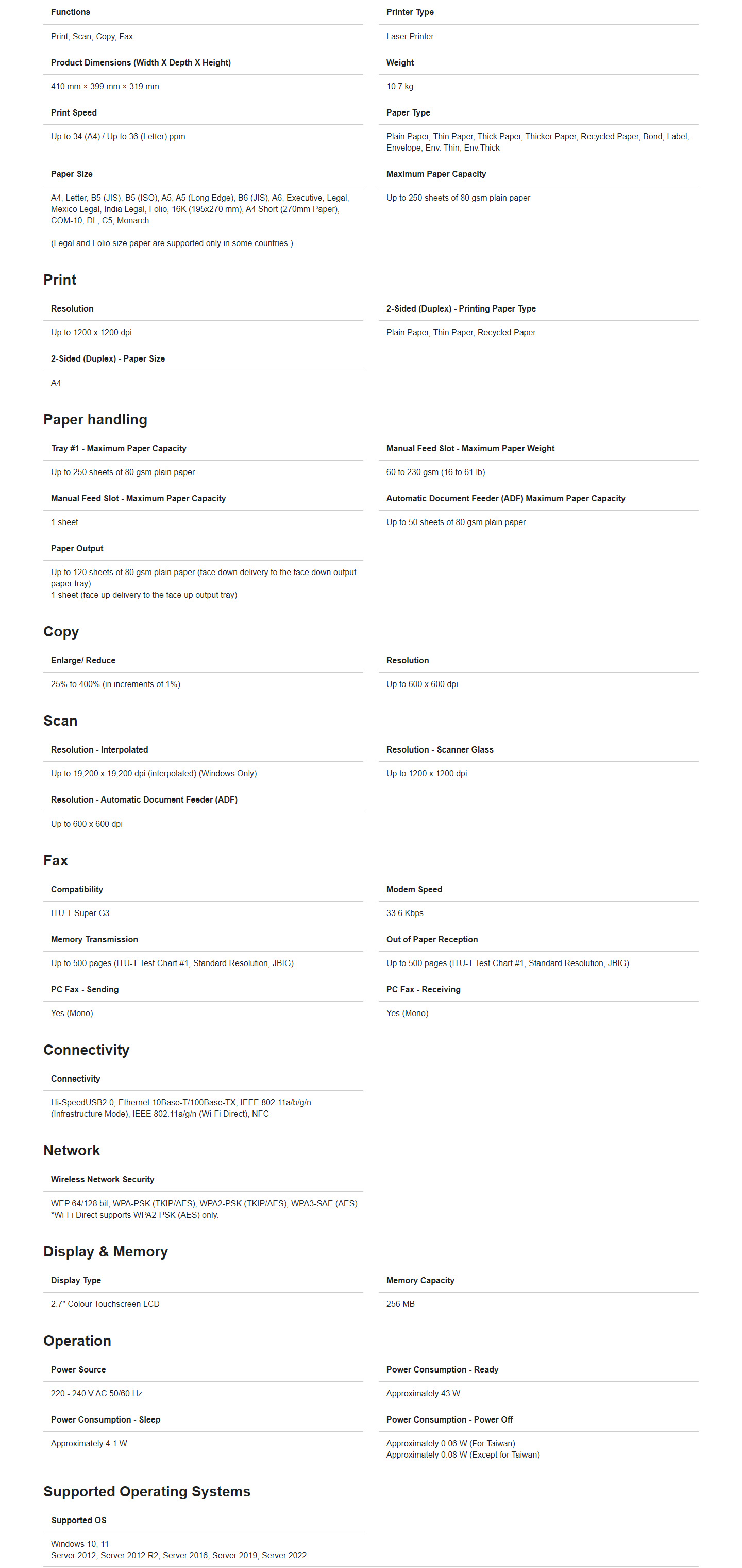 Auto 2-sided (Duplex) printing, 50 sheets dual CIS Auto-Document Feeder (ADF), 2.7” Colour LCD touchscreen