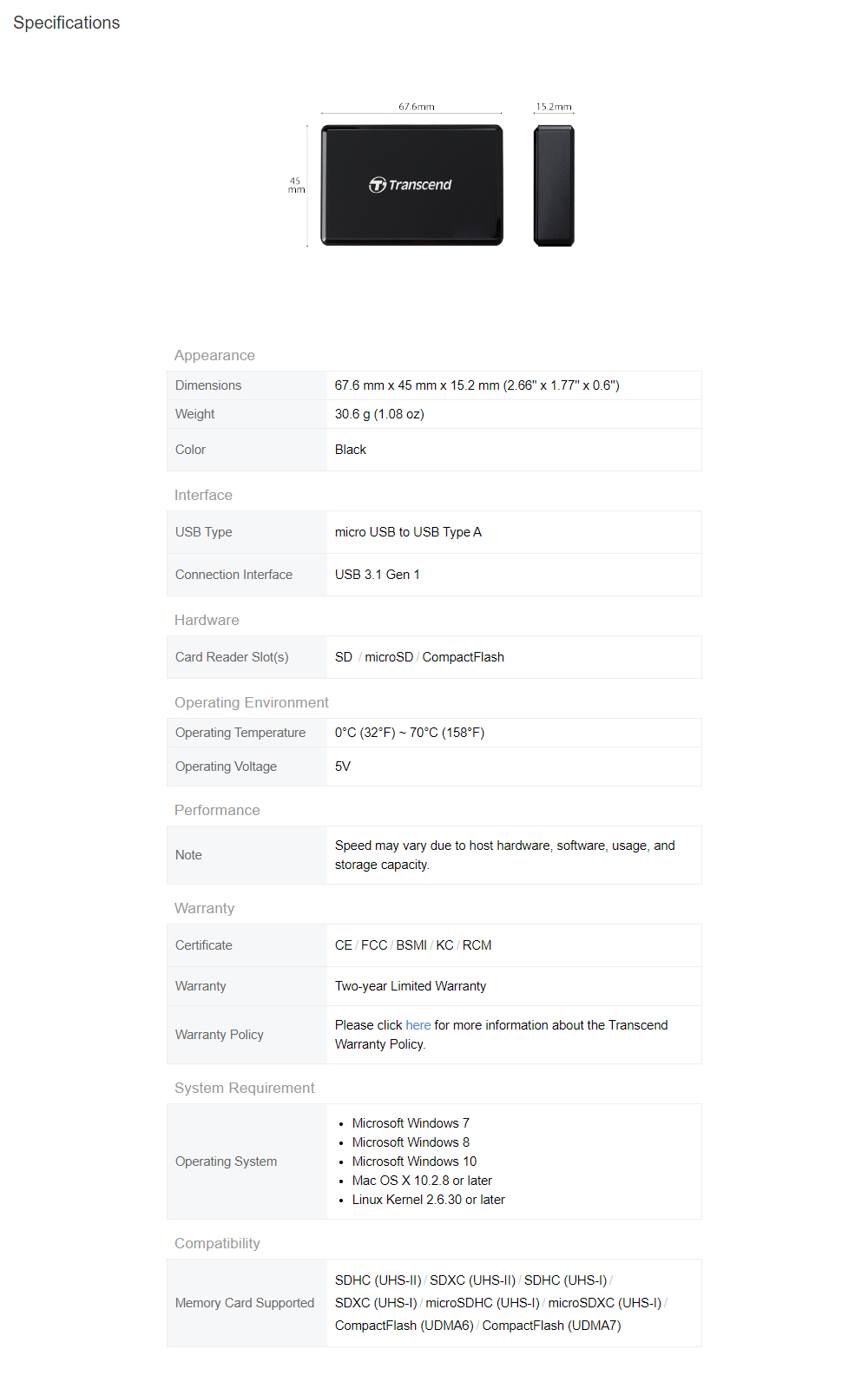 Transcend All-in-1 UHS-II Multi Card Reader, USB 3.1